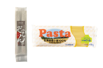 石狩産のそば粉と道産小麦をブレンドしたそばと、道産小麦100%のプリッとした食感のパスタをセットで。