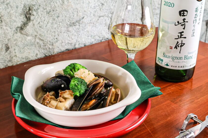 冬が旬の道産のホタテとアサリ、ムール貝をアロマティックな香りとなめらかな味わいの「田﨑正伸 ソーヴィニヨン・ブラン」で蒸しあげました。爽やかな果実香と酸味が魚介のうま味を引き立て、かつワインの味わいもより奥深く感じられます。