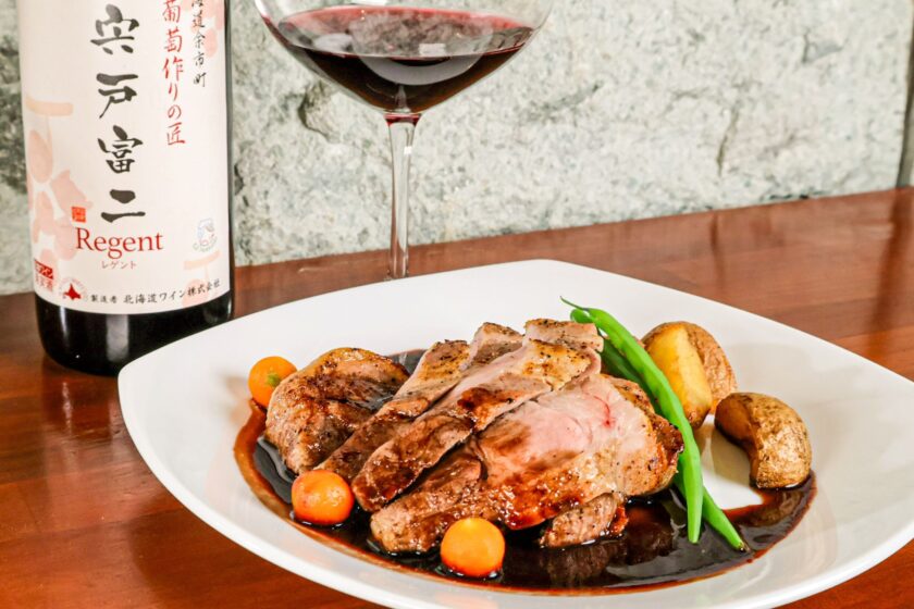 肉質が柔らかくジューシーな余市産の豚肉をソテーし、「宍戸富二 レゲント」を使ったスパイシーなソースで仕上げました。程よいタンニンと軽やかな酸、そして豊かな果実味が調和した宍戸富二 レゲントが、赤身のコクと脂のうま味を引き締めてくれます。